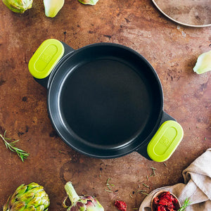 Incluye dos asas de silicona en color verde para coger la cacerola con comodidad y tapa de cristal.