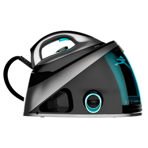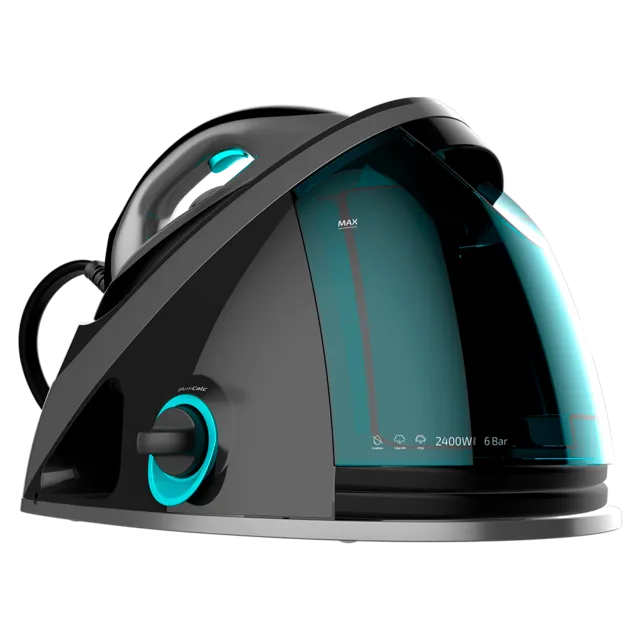 Centro de planchado 2400 W. Golpe de vapor de 480 g/min y 145 g/min. 6 bares. Suela Turbo Slide. Filtro antical de varilla descalcificadora Pro Clean. Seguridad contra sobrecalentamientos.