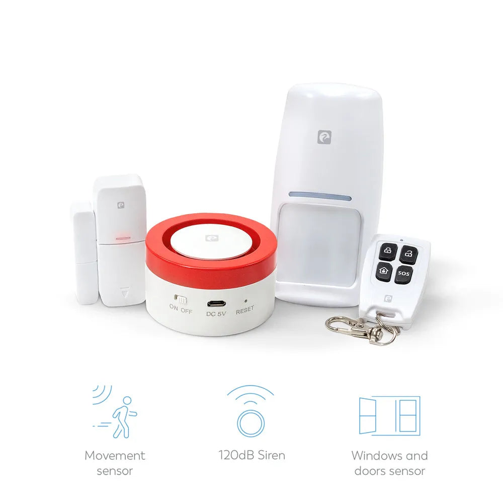- Incluye un sensor de movimiento con ángulo de detección 110º , un sensor de apertura de puertas o ventanas y un mando a distancia para control remoto con opción de armado/desarmado de alarma y función SOS. Pilas incluidas en todos los accesorios.
