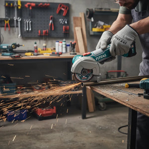 Con la Miniamoladora a batería 20V TOTAL, tendrás una increíble velocidad en vacío de 19500 rpm y un disco de 76 mm que te permite realizar cortes precisos.