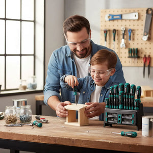 Descubre el juego de destornilladores más completo del mercado con soporte organizador incluido. 50 piezas de cromo vanadio, mangos antideslizantes y sistema imantador integrado. ¡Organización y profesionalidad en un solo kit!