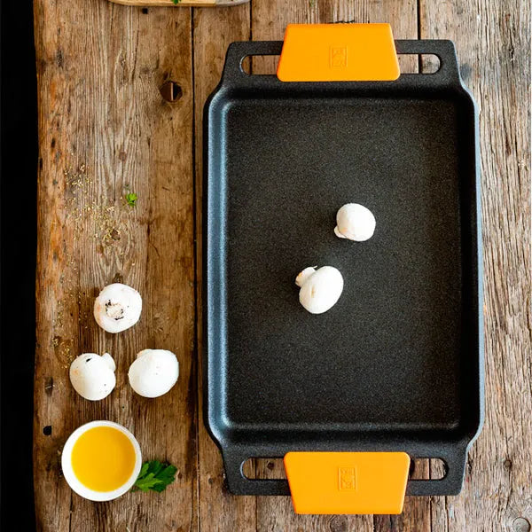 La parrilla lisa Efficient Plus es ideal para cocinar los alimentos de una forma muy sana y sencilla, tanto en el fuego como en el horno. Su amplio fondo difusor es perfecto para preparar a la vez tanto la carne o el pescado, como la guarnición con la que se quiera acompañar. De forma rápida, sin apenas grasas y sin que se pegue nada, podrás preparar unas comidas y cenas de lo más deliciosas. Pincelando la parrilla con el aceite habitual o bien con uno aromatizado, podrás darle un punto diferente a la carne o al pescado en cada ocasión. Platos sabrosos y saludables con un toque especial, para hacer de cada comida algo diferente. Unas rodajas de merluza con unos espárragos verdes y un poco de aceite de gambas, un entrecot de ternera con las setas que prefieras y aceite de trufa o de boletus, una parrillada de verduras variadas con aceite de ajo, unos calamares con unas láminas de calabacín con aceite de oliva o unos mejillones abiertos en el grill con un poco de pimienta resultarán deliciosos. Su superficie lisa te permite utilizarlo incluso como bandeja para hornear tartas de hojaldre, galletas, pizzas, empanadas o una focaccia de lo más apetitosa. Recetas sanas y muy apetitosas en una parrilla versátil, robusta y duradera con la que podrás cocinar de forma eficiente y que además se limpia muy fácilmente.