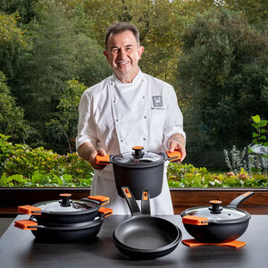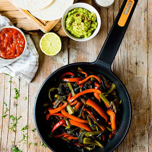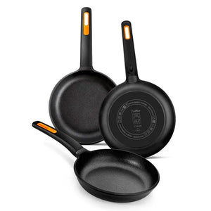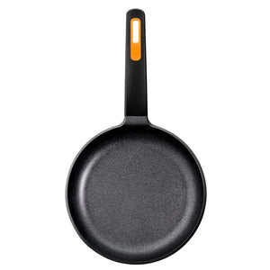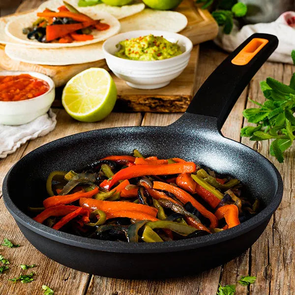 Es una sartén ideal para preparar todo tipo de recetas, incluso las más elaboradas, combinando sus diferentes tamaños. Las más pequeñas son perfectas para preparar salsas o hacer huevos fritos, al tiempo que en las de mayor diámetro puedes cocinar la carne, el pescado o una pechuga de pollo a la plancha, dorar unos filetes de lomo empanados o hacer patatas fritas. Son ideales tanto para saltear champiñones y preparar un revuelto de setas, como para elaborar pisto, salsa boloñesa, cualquier pasta a la carbonara o para cocinar la bechamel de las croquetas. Las sartenes más pequeñas tienen el tamaño perfecto para que puedas freír croquetas, empanadillas, buñuelos o rosquillas de forma óptima, rápidamente y manteniendo la temperatura del aceite. En todos sus tamaños, cocinar con ellas se convierte en una experiencia extraordinaria gracias a su enorme resistencia.